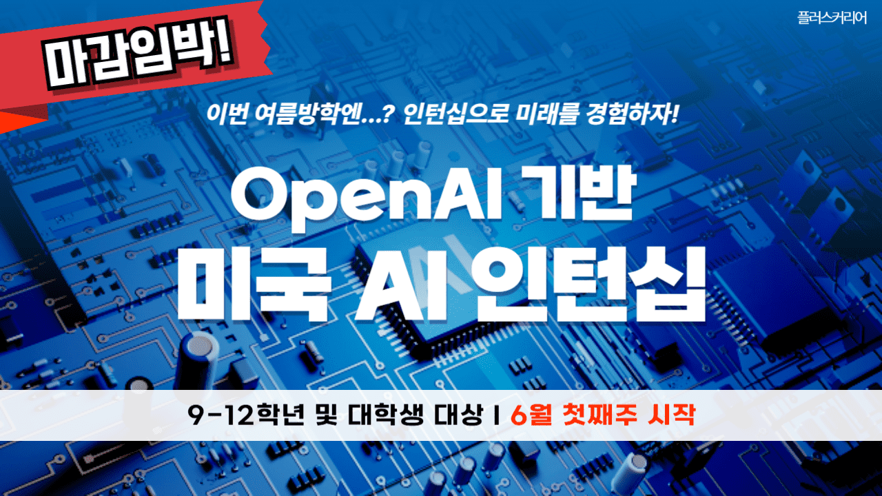 모든 산업의 핵심 AI 9-12학년 학생들에게는 단 한 번이어도 남들이 하지 않은 차별화된 경험으로 대학입시 경쟁력 UP! (예비)유학생들에게는 캠퍼스 리쿠르팅에서 이력서 경쟁력 UP! 이번 여름방학에는 미국 AI 원격 인턴십으로 차별화된 경험을 쌓으세요! 왜 AI(인공지능) 인턴십인가? AI는 단순 기술을 넘어 경제 및 사회 전반에 변화를 주도하고 있으며 기업들은 데이터 기반 의사결정, 자율주행, 고객 맞춤형 서비스 등 다양한 분야에서 AI를 활용해 경쟁력을 강화하고 있습니다. 이에 AI활용 능력을 갖춘 인재 수요가 증가하고 있으며 미국 AI 인턴십을 통해 취업 시장에서 경쟁력을 높일 수 있습니다. AI 인턴십을 통해 무엇을 기대할 수 있나요? AI 인턴십을 통해 #실무경험 #최신기술 #취업경쟁력 #네트워크를 모두 확보할 수 있으며 AI분야에서 성공적인 커리어를 쌓고 싶다면 실제 기업 환경에서 경험을 쌓는 것이 가장 좋은 출발점 입니다. 1. 실무경험을 통한 기술 역량강화 학교에서 이론적으로 배운 AI 기술을 실제 프로젝트에 적용해볼 수 있고 동시에 이론으로는 얻기 힘든 중요한 실무 기술 또한 향상시킬 수 있습니다. 2. 빠르게 변화하는 최신 기술 트렌드 습득 실무에서 OpenAI와 같은 최신 AI 모델과 기술을 다루는 것은 지원자의 전문성을 높이는데 큰 도움이 되며 이는 취업시장에서의 경쟁력을 높일 수 있습니다. 3. 차별화된 이력서 & 포트폴리오 구축 인턴십을 통해 수행한 프로젝트는 취업시 강력한 자신만의 포트폴리오가 되며 기업이 선호하는 실무기반 AI 역량을 증명할 수 있습니다. 4. 멘토링 기회와 네트워크 확대 AI 전문가와 협업하면서 배울 수 있는 환경을 제공하며 같은 목표를 가진 사람들과 교류하여 미래의 기회를 넓힐 수 있습니다. 어떤 업무가 진행되나요? 인공지능 연구 및 개발 기업인 OpenAI에서 제공하는 API(Application Programming Interface, 응용 프로그래밍 인터페이스)를 활용한 프로젝트가 진행됩니다. 이런 분들께 추천 드립니다. [고등학생(9-12학년)] - AI관련 전공 미국 대학 진학을 목표로 하는 9-12학년 학생 - AI 개발 경험으로 특별한 액티비티를 만들고 싶은 9-12학년 학생 [대학생] - 졸업 후 AI분야로 미국 취업을 희망하는 (예비)유학생 - 취업 트렌드에 맞춘 인턴십 경험을 쌓고 싶은 (예비)유학생 프로그램 시작일 및 기간 6월 첫째주 시작! / 12주 진행 ※인턴십 시작 전 해외취업교육, 이력서 작성, 인터뷰 등이 진행됩니다. ※인원 제한으로 선착순 마감됩니다. AI 인턴십 프로그램북 신청 문의 (이메일) info@pluscareer.net (전화) KR 02-561-6306 / US 917-460-1419