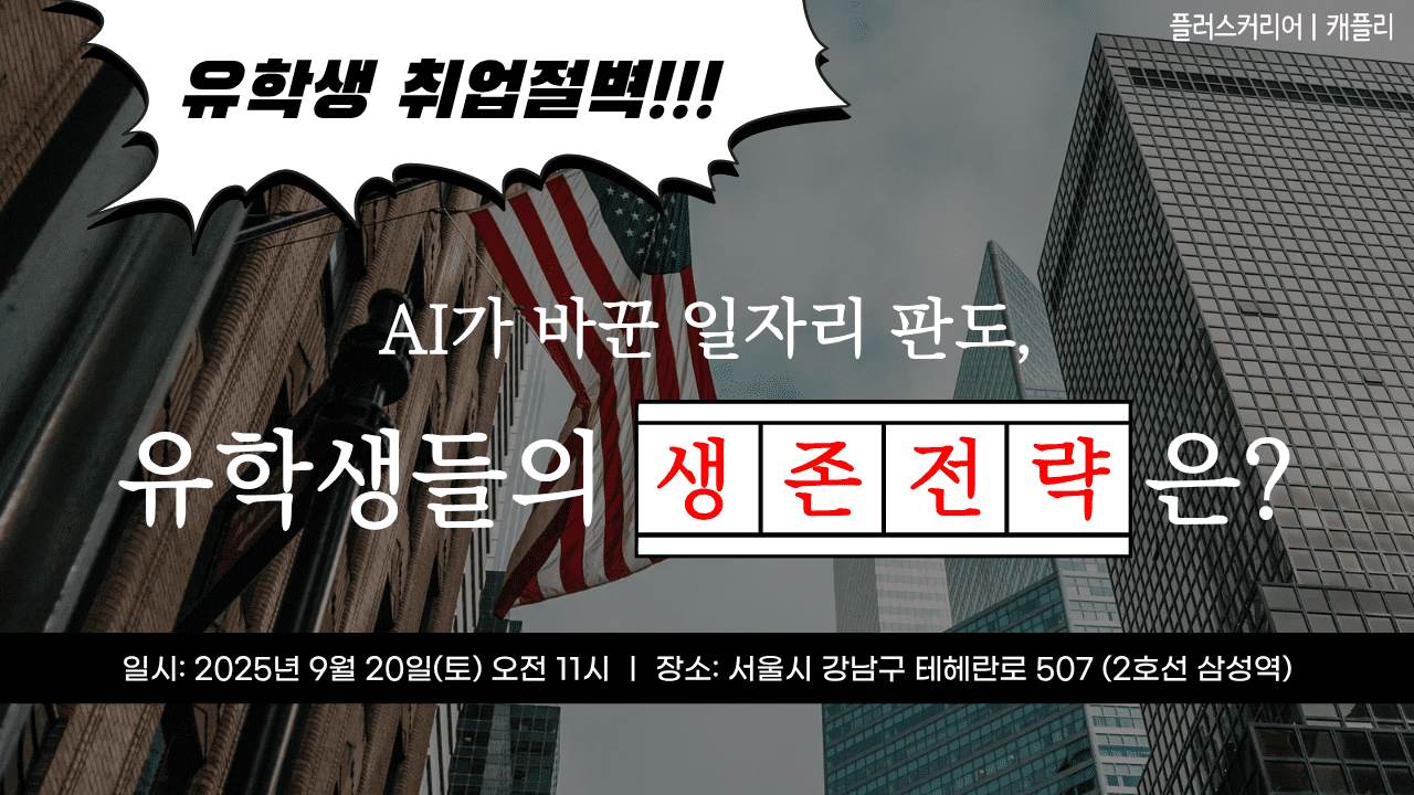 AI로 인한 직업의 급변화가 현실로 다가오면서, 특히 미국 유학생들은 미국 시장 및 정책의 변화를 충분히 리서치 하고 진로를 결정해야 합니다. 유학 후 미국 취업을 희망하는 유학생의 커리어 로드맵, 언제, 어디서부터, 어떻게 시작해야 할까요? ■ 내용 - AI로 인한 미국 취업 시장의 변화 - 미국 대학 입학 전 10-11학년에 미국 고용 시장 및 직업 분석을 해야 하는 이유 - 대혼돈의 취업 시장 변화 속에서도 고용 안정성이 높은 분야, 분야별 지역, 직업은? - 최상위권 / 상위권 / 중위권 각각의 학생별 현실적인 유학 및 진로 선택방법 - 국제 비즈니스 신뢰의 메가 브랜드 Big4로 각 분야의 전문가가 모이는 이유 ■ 대상 - 미국 유학을 계획 중인 고등학생(9~12학년) 혹은 N수생 - 미국 유학 후 미국 취업 및 정착을 목표하는 학생 (대학 1~2학년) ■ 특강자 - 남광우 교수 (JD, CPA, 서강대 국제대학원) ■ 장소/일시 - 설명회 일시: 2025년 9월 20일(토) 오전 11시 - 설명회 장소: 서울시 강남구 테헤란로 507, B1 (세미나실) *유료주차인 관계로 대중교통 이용을 권해드립니다. ※자리 한정으로 아래 버튼을 통해 반드시 예약해주세요. 세미나 신청 ※남교수님과의 1:1 심층상담 무료 진행 예약과 함께 상담신청서를 남겨주시는 분들 중 반드시 도움이 필요하다고 판단되는 분에게 남교수님과의 1:1 심층상담을 무료로 진행할 예정입니다. (최대 5명) 상담신청서는 세미나 예약 후, 확인메일과 함께 발송됩니다. 문의 (이메일) info@pluscareer.net (전화) KR 02-561-6306 / US 917-460-1419